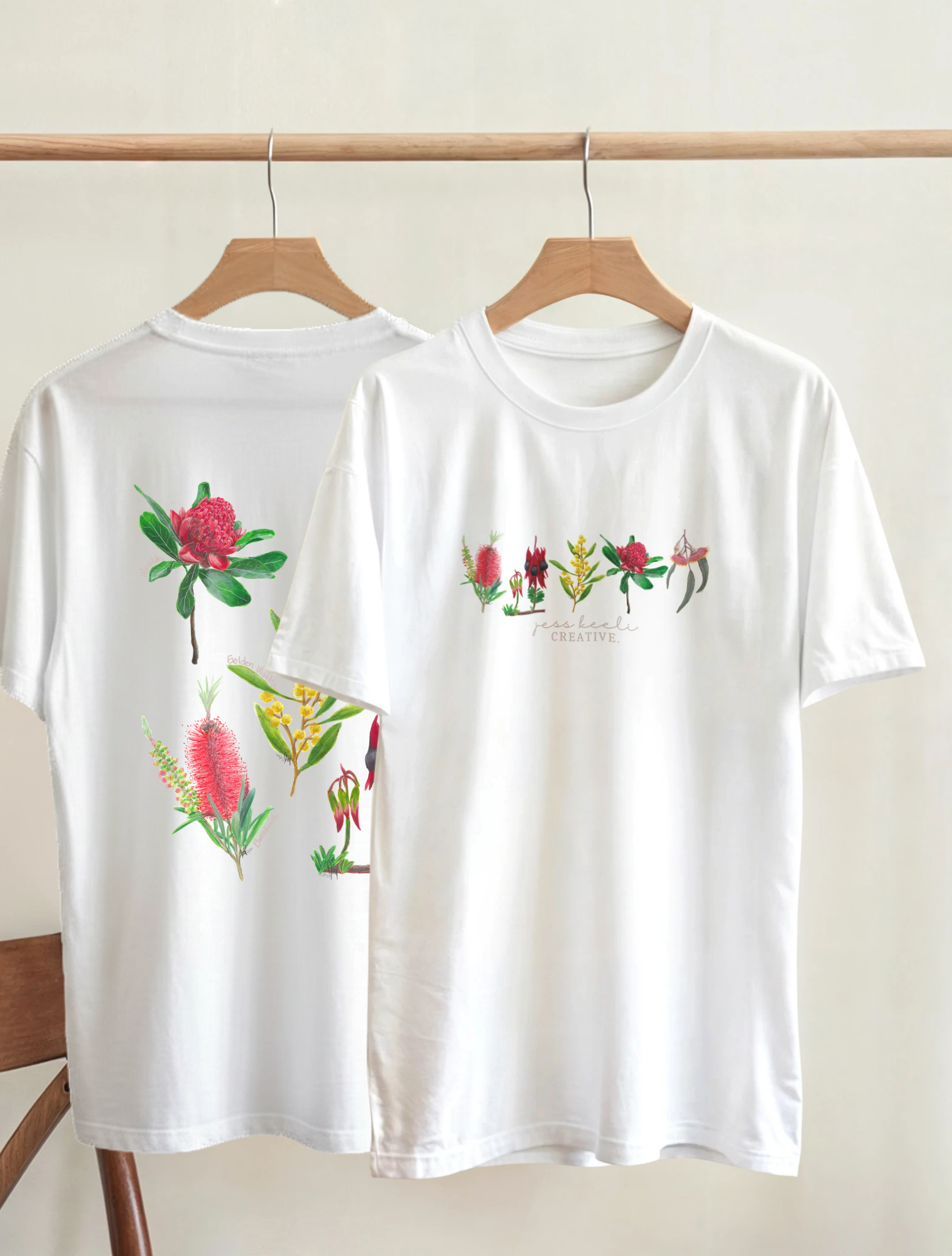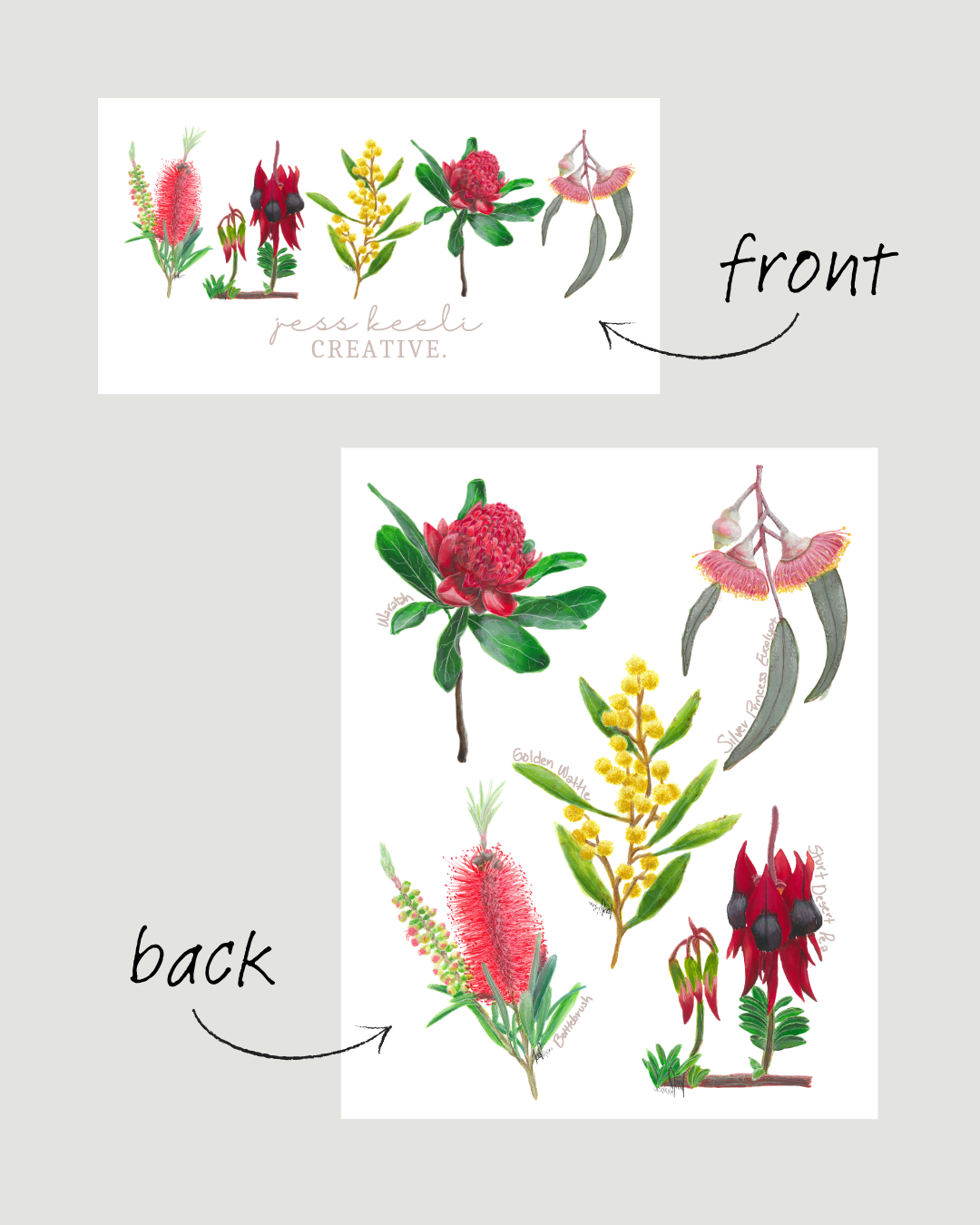 This one is for the Aussie flora lovers - featuring Bonnie the Bottlebrush, Stella the Sturt Desert Pea, Wilma the Wattle, Willow the Waratah, and Edith the Silver Princess Eucalypt. A simple line-up and logo on the front, and a party in the back!