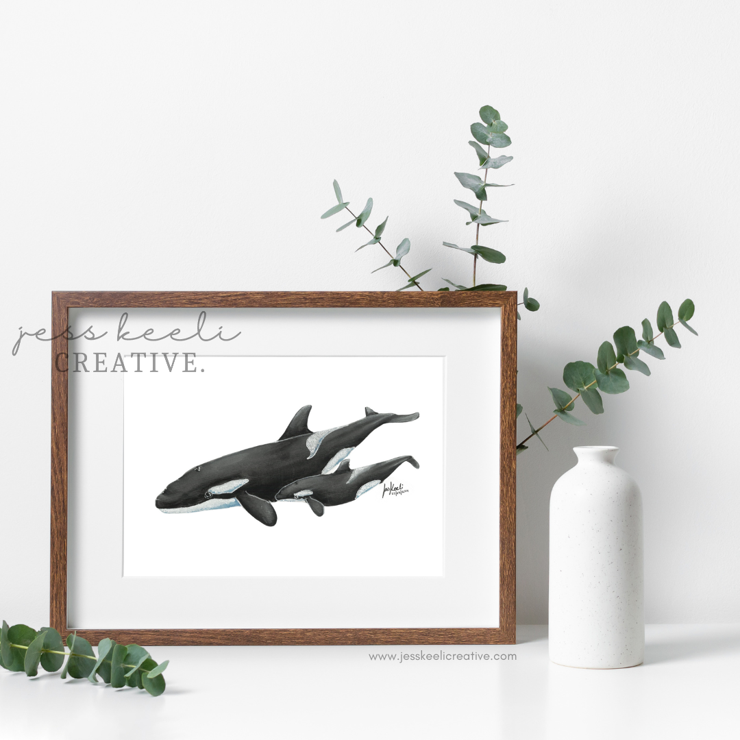 Big and little, this orca duo is pure ocean magic. It's a splash of family love in monochromatic tones for your walls.