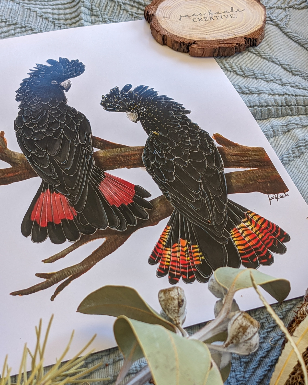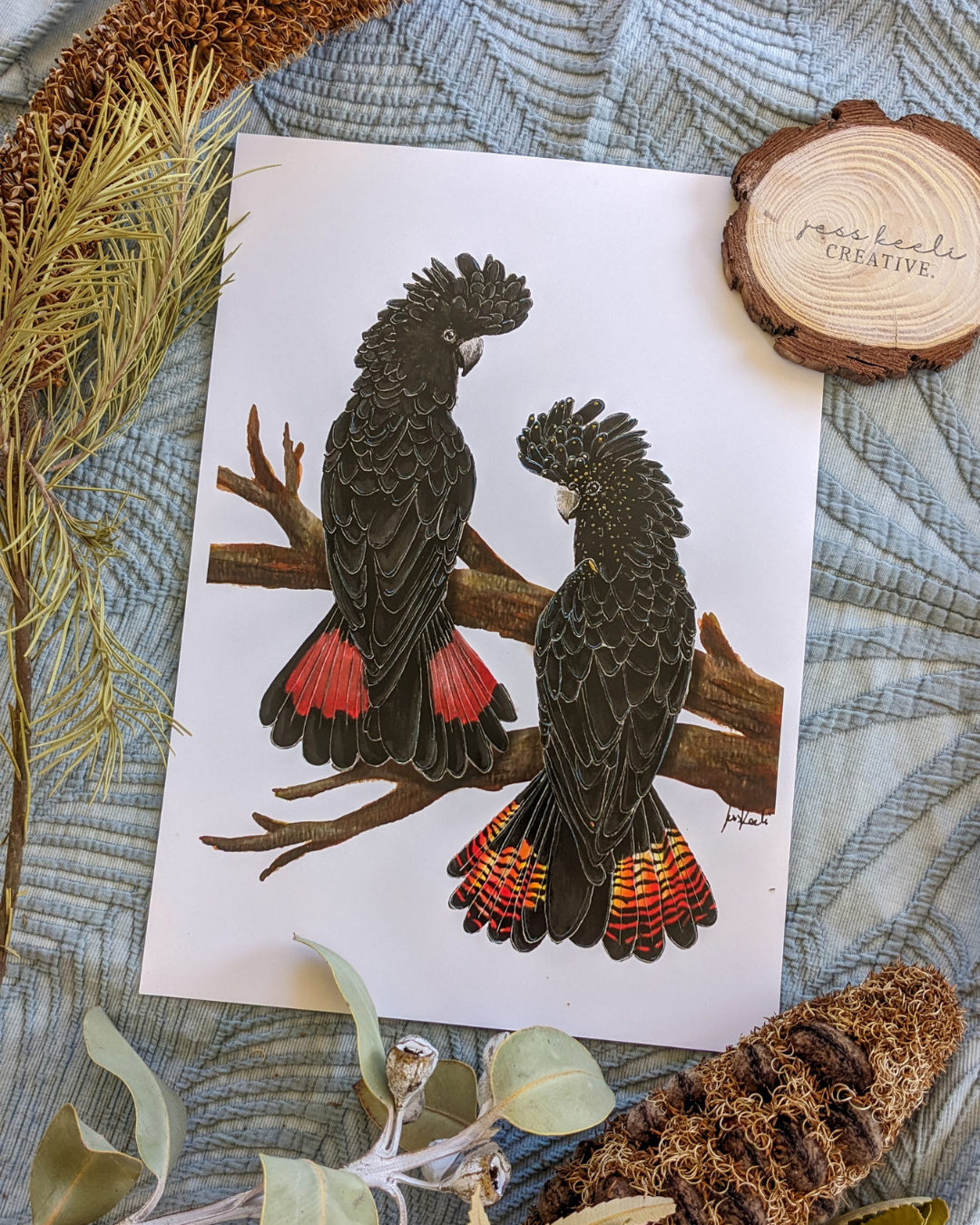 These two red-tailed black cockatoos were originally created separately, but this power couple deserve to be together to bring a sense of connection, contrast, and Aussie elegance to your walls.